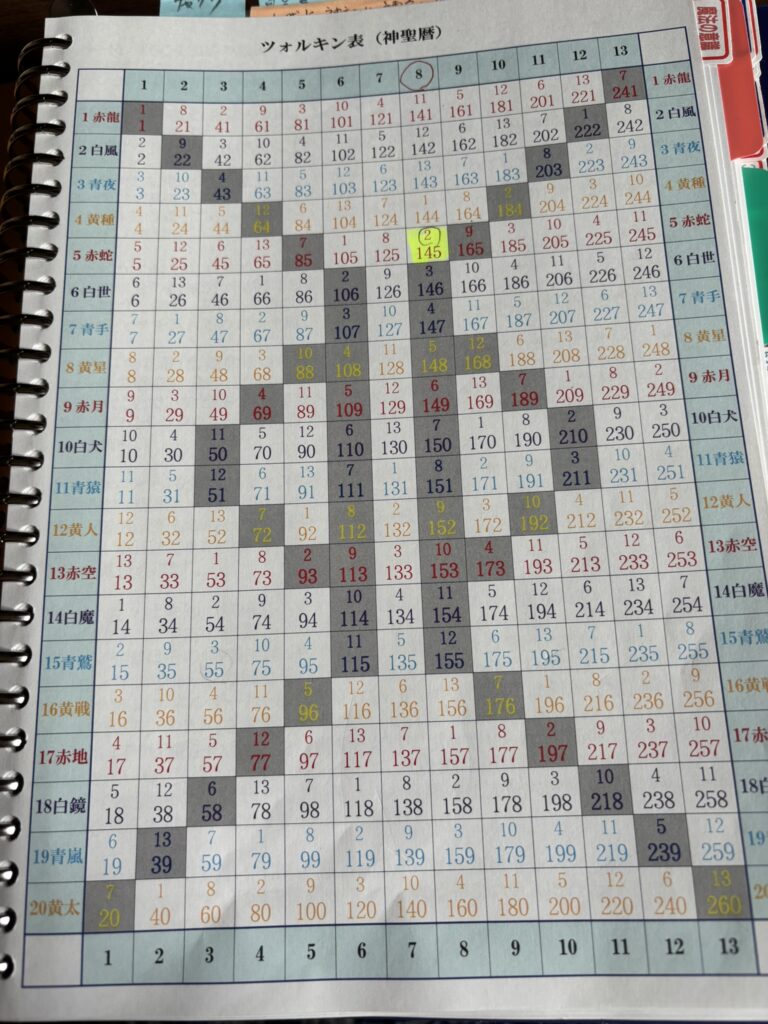 講師テキストを読んでいて、?になった。黄色い美の星のページ、「260のツォルキン表を見ると黄星の二次元はKIN248~KIN260に位置します」ツォルキン表と睨めっこ。! 縦の列KINの上の数字は音響だ。黄星は8番目の気神。横の列が一次元のKINナンバーだ。今頃、気が付いた。私らしいと苦笑いです。