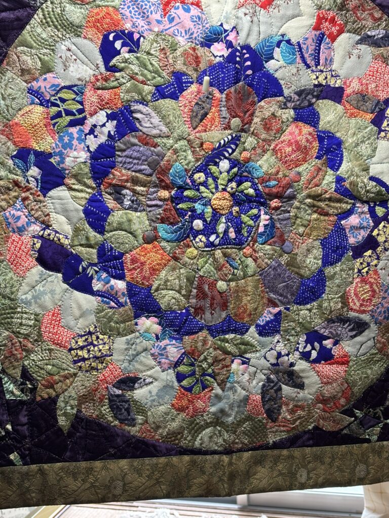 心引かれるキルトに出会いました。まるで、曼陀羅のよう。藍、絞、様々な古布を使用している。鮮やかな中にも落ち着きがあり、毎日見ていたい。携帯の壁紙にすることを思いつきました。初めて見る作風、魂が震えました。
